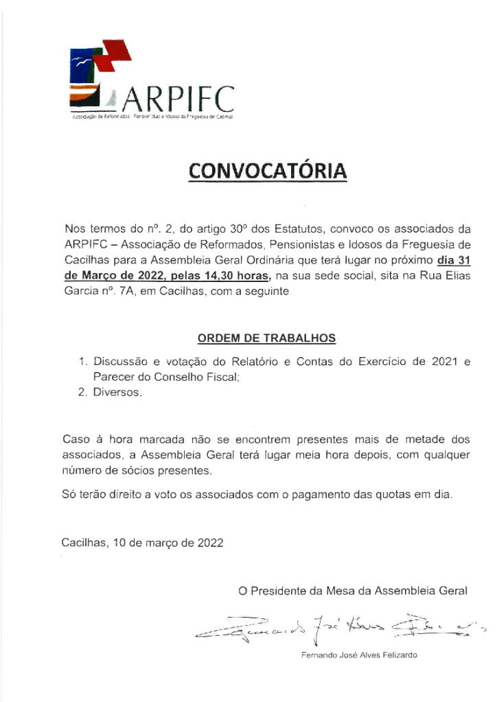 Nos termos estatutário, convoco para dia 31 de Março, pelas 14:30, na sede da Rua Elias Garcia, nº 7A, em Cacilhas, a Assembleia Geral Ordinária para discussão e votação do relatório e contas do ano 2021, bem como do parecer do Conselho Fiscal.